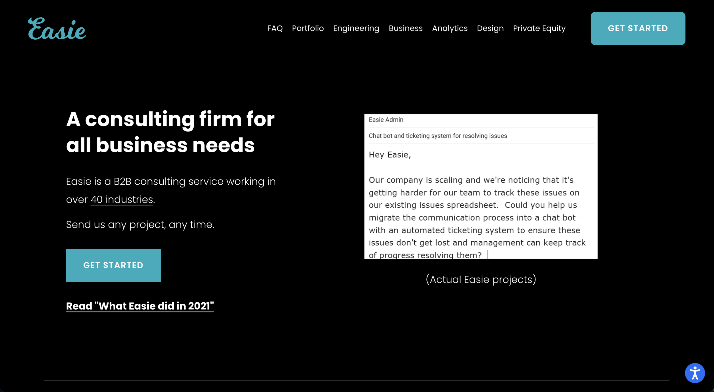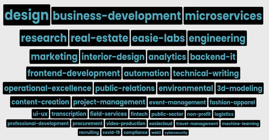Easie’s homepage has a responsive word cloud that visually shows project types demanded by clients over the past five years. Clicking on a tag in the word cloud leads to a collection of micro-case studies for that specific tag (e.g. engineering).